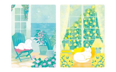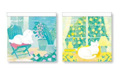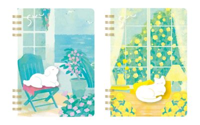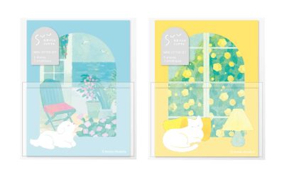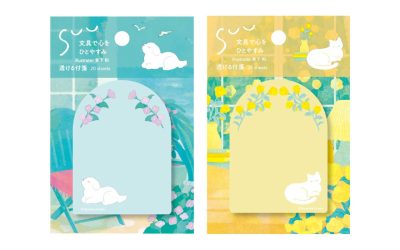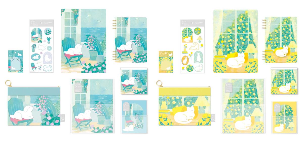 第1弾では、イラストレーター・宮下和さんとコラボレーションします。デザインは、海辺の白い街でまどろみながら飼い主の帰りを待つ犬を描いた「海風と犬」と、窓辺の陽だまりの特等席で心地よく目を閉じている猫を描いた「窓辺の猫」、2つの世界観を楽しめます。ラインアップは、『下じき』『ノート』『メモパッド』『レターセット』『ミニレター』『付箋』『シール』『ポーチ』の全8アイテムです。