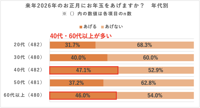 20代以上の男女2,405名を対象にした調査で「来年2026年のお正月にお年玉をあげるか」と質問したところ、「あげる」が40.4%と、2026年のお正月は4割がお年玉をあげる予定であることがわかった。「あげる」人を年代別でみると、最多が「40代」47.1%、次いで「60代以上」46.0%と、特に40代と60代が多かった。