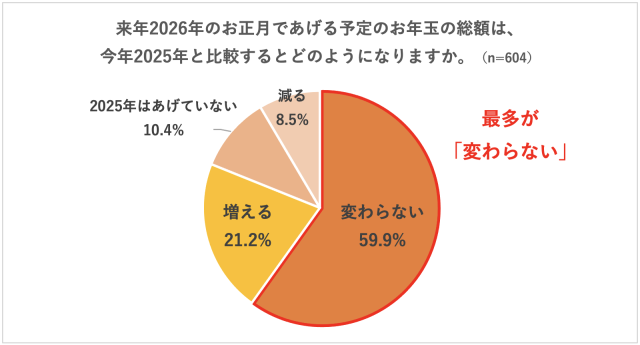 「来年2026年にあげる予定のお年玉の総額は、今年2025年と比較するとどのようになるか」の質問に対し回答は、「変わらない」が59.9%と最多で、次いで「増える」が21.2%だった。「減る」は8.5%と、1割未満にとどまった。