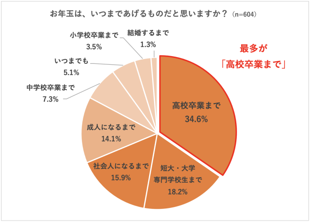 「お年玉は、いつまであげるものだと思うか」と質問すると、「高校卒業まで」が34.6%と最も多く、次いで「短大・大学・専門学校生まで」18.2%、「社会人になるまで」15.9%だった。