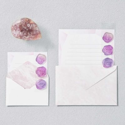 今回新発売するレター『MINERA(ミネラ)』は、鉱物をモチーフにしたデザインです。ラインアップは、「ブルーレースアゲート」「ピンクアメジスト」「ジェイド」「マーブル」の4種類で、鉱物の質感を思わせる色味や模様により、デザインごとに異なる表情を楽しめます。サイズは郵送に便利な定形郵便サイズと、ギフトに添える際などに最適なミニサイズの2種類です。付属するシールは、クリアタイプのシーリングワックスのような見た目と質感です。封緘や装飾のアクセントとして使用でき、立体的で上品なワンポイントが、レターに特別感をプラスします。