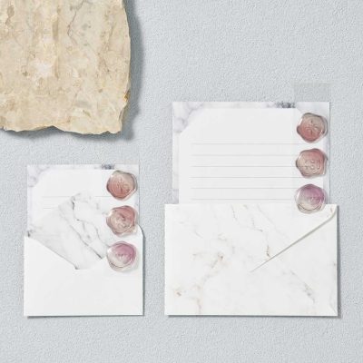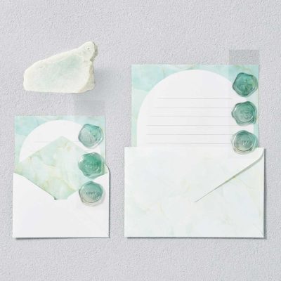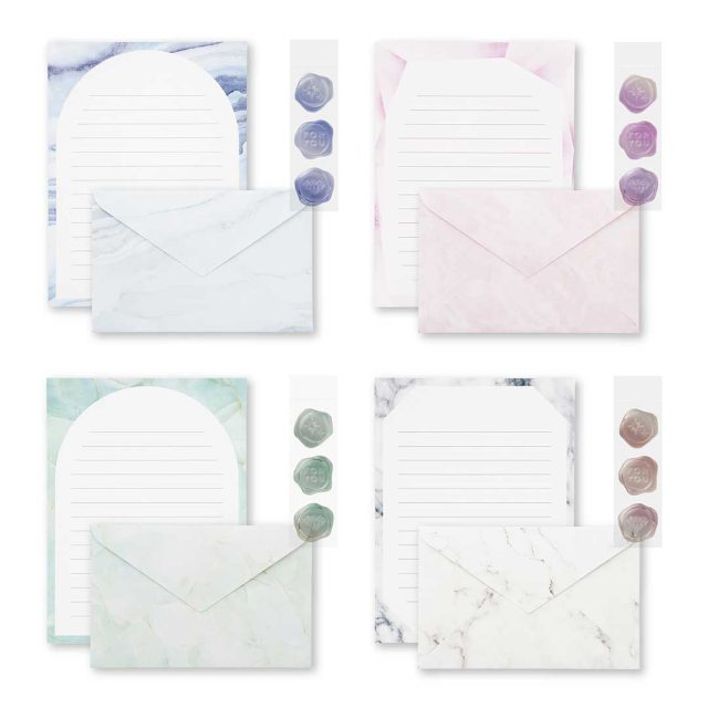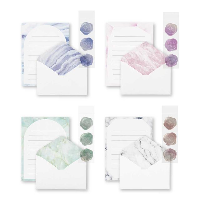 価格:583円(税込)/種類:4種(ブルーレースアゲート、ピンクアメジスト、ジェイド、マーブル)/製品寸法:[封筒]W140×H90mm、[便箋]W127×H168mm/内容:封筒3枚、便箋6枚、シール3枚/製品紹介ページ:https://paper.maruai.co.jp/shop/c/c07019971/
