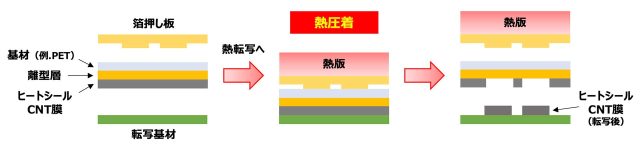 箔押し機を用いて加熱・加圧することで、ヒートシールCNT膜を対象物に転写する方式です。安定した転写性に優れ、量産工程への適用が可能です。
