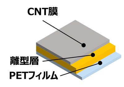 『熱転写CNT透明導電ナノシート』は、基材であるPETフィルムと、厚み1μm以下のCNT膜との間に離型層を設けた三層構造です。シートを加熱・加圧することで、基材からCNT膜のみが剥離し、対象物の表面に転写されることで導電性を付与することができます。