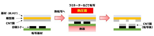 ラミネーター機などを用いて加熱・加圧することで、複合機などで出力した転写基材にCNT膜を転写する方式です。部分的な転写やパターン形成がしやすく、試作や小ロット用途に適しています。