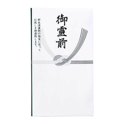 | ■御霊前 新生活運動の趣旨に沿ってお返しを辞退致します。/群馬県・栃木県(両毛地区) 香典を贈る際に、香典返しを辞退する旨を伝える目的で使用します。戦後の経済的に厳しい時期に、相手に負担をかけないよう「香典を少なくして香典返しを辞退する」という考え方が広まりました。その習慣はとくに群馬県の一部地域に定着し、現在も受け継がれています。 |